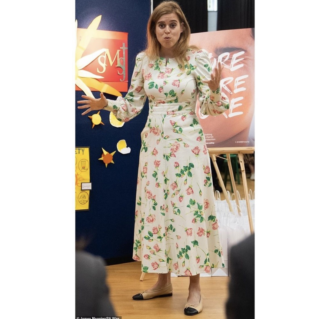 Принцесса Йоркская принимает активное участие в работе British skin Foundation . Как патрон этого объединения, которое объясняет детям опасность УФ лучей и как оберегать кожу от ожогов , Беатрис приехала с небольшой лекцией в школу святых Марии и Иоанна в Лондоне. Получив цветы и рассказав о том, как правильно загорать, Беа пообщалась со школьниками. Платье от бренда Me and Em. Туфельки Chanel.
