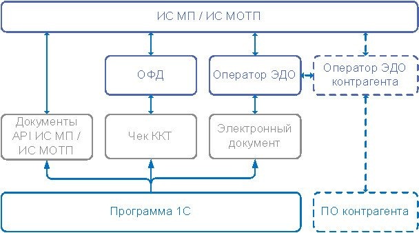 Программы 1С лишь получают эти данные от ИС МП. Изменение владельца и статуса происходит также на стороне ИС МП на основе переданных ей данных, причем они могут передаваться непосредственно из 1С или опосредованно, через оператора электронного документооборота (ЭДО) или оператора фискальных данных (ОФД), рис. 1.