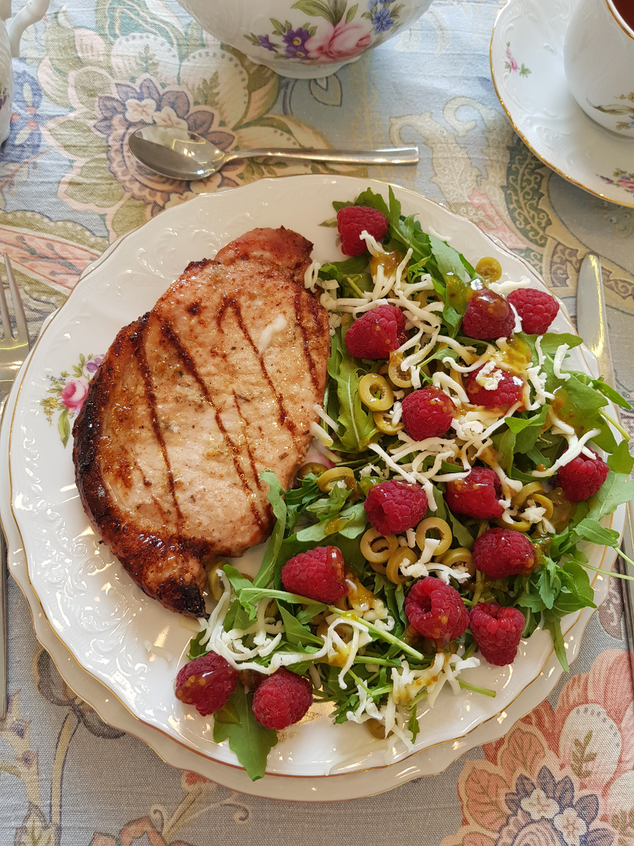 Свинина с хреном и горчицей и салат из руколлы и малины