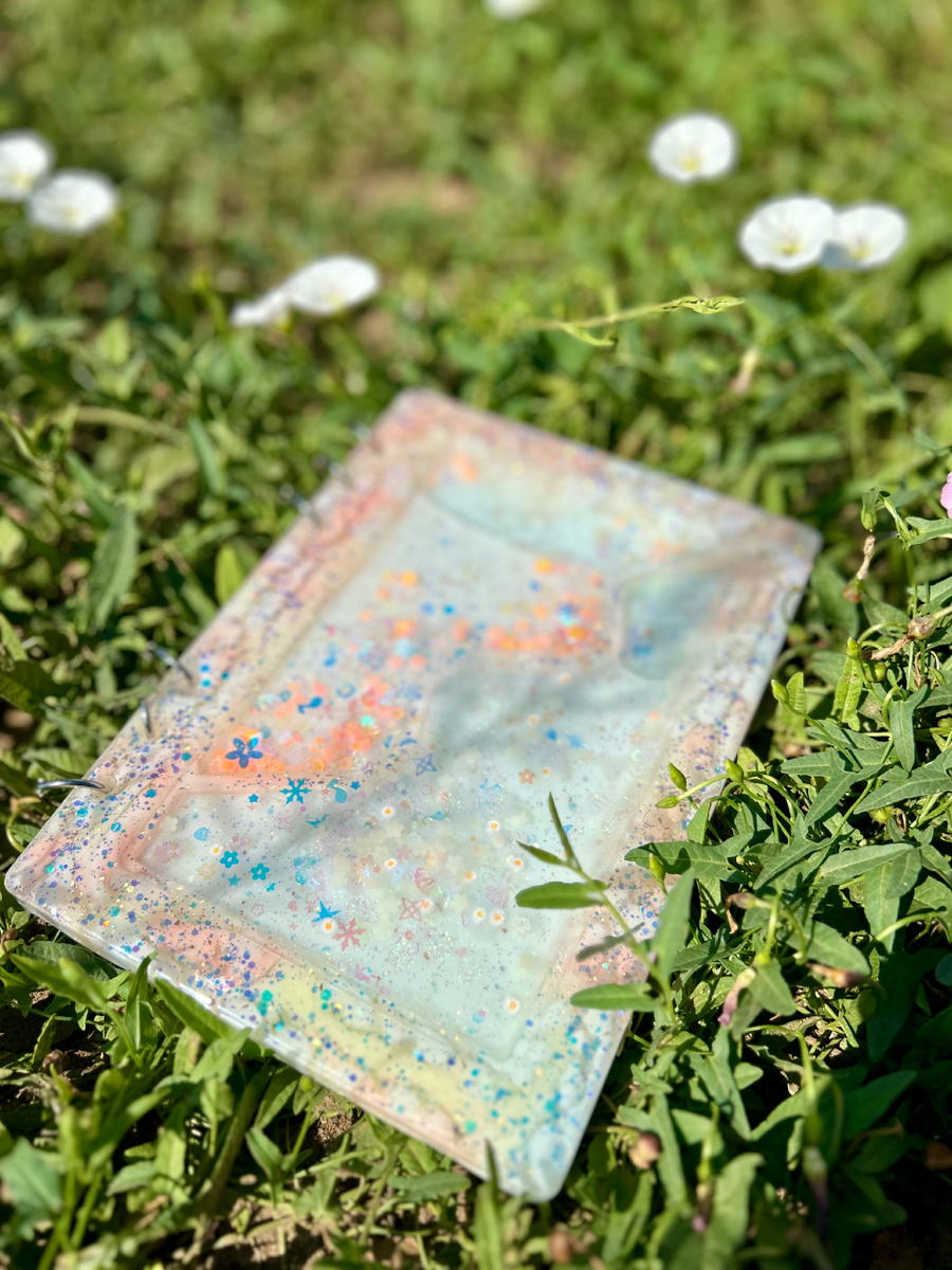 Причем на одном из финишных этапов) Сперва всё шло великолепно, я даже удивилась 😁 все получалось, как задумывалось) эффект, который хотела!) Но.. как только дело дошло до наполнения пространства жидкостью, мои руки стали, будто не родными.. Весь глицерин вытекал из щелей, вытираю с одной стороны, вытекает из другой.. сверху вытирать его было вообще невозможно, от любого надавливания, он снова появляется на поверхности, стекает на стол) 😰 1 раз я перевернула банку с глцерином, он набрызгал на все часы, которые стояли рядом..) 🥹 сама Я вся была в нем.. а мне надо было запечатать жидкость внутри, чтобы залить финишный слой смолы) а, насколько мы знаем, смола не контактирует с прочей жидкостью и может не застыть) В общем, отдышавшись с часик, я вернулась и уже спокойная, взяв себя в руки, убрала сперва всё пространство вокруг, запечатала все щели, залила финиш и вот он — результат!) Надеюсь, мои нервные клетки умерли не зазря) Блокнотик залит смолой Промокод на скидку 7% призак