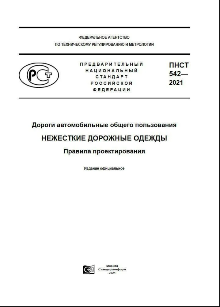 Титульный лист ПНСТ 542-2021. Скриншот из документа. Вопрос: А какая на сегодняшний день актуальная методика расчета дорожной одежды? ОДН 218.046–01 тоже отменен. Ответ: Предварительные национальные стандарты (ПНСТ) разрабатываются как предварительные версии будущих национальных стандартов. ПНСТ имеют ограниченный срок действия. За время действия ПНСТ накапливается опыт использования положений стандарта, который в дальнейшем может быть принят за основу ГОСТ, либо отменен или кардинально переработан. Взамен ПНСТ 542-2021 разработан проект ГОСТ Р "Дороги автомобильные общего пользования. Нежесткие дорожные одежды. Правила проектирования". Данный стандарт будет принят в ближайшее время. То есть на данный момент он не действующий. (ссылка на проект ГОСТа в первых комментариях). Таким образом срок действия ПНСТ 542 истек. Нового аналогичного документа пока не разработано. В таком случае в первую очередь следует выполнять требования ТР 014/2011, ТР № 384-ФЗ и документов их доказательных