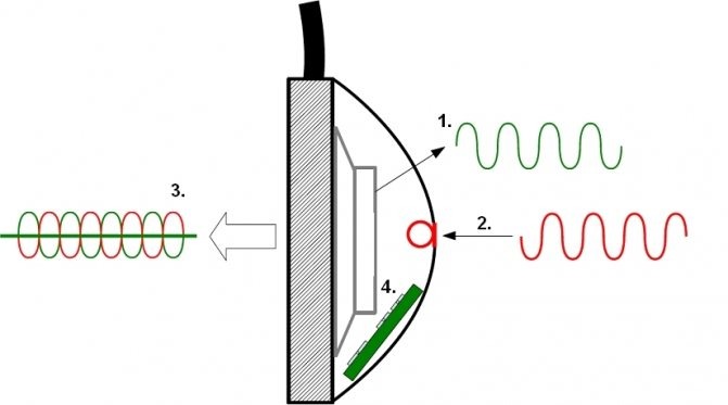 Две волны накладываются друг на друга, «отзеркаленный» шум интерферирует с основным, в итоге получается что-то вроде тишины: