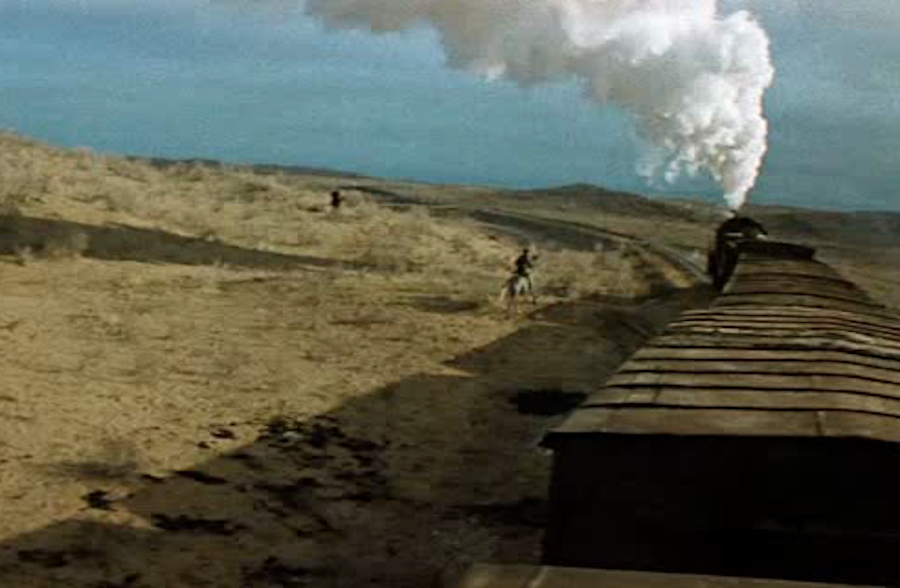 Начинается погоня на лошадях под замечательную и широко известную мелодию. Кстати, стоит обратить внимание, что поезд на заднем плане действительно другой, и там есть платформа с лошадьми. Но дорога все равно одноколейная. Хотя обычно именно в таких моментах бывают ляпы.