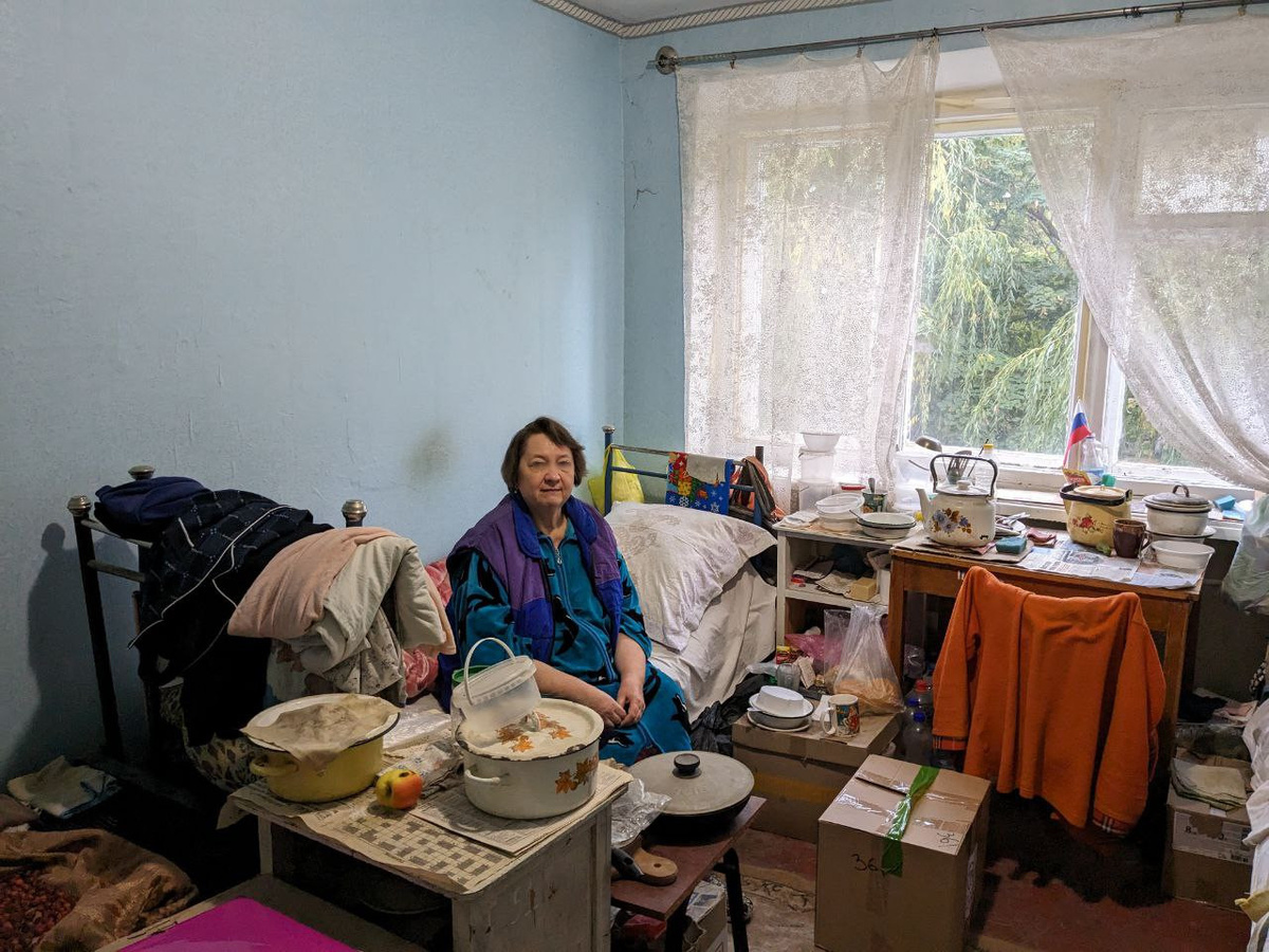 Когда наша Таня зашла в комнату к Александре - увидела улыбчивую интеллигентную женщину сидящей на кровати, а вокруг нее - тюки с гуманитарной помощью - вся гуманитарка, которую она нажила за несколько месяцев жизни