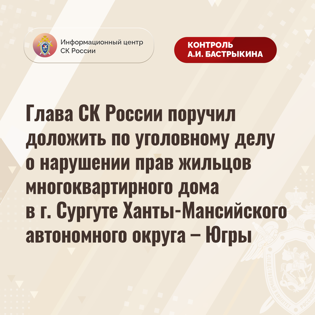 Глава СК России поручил доложить по уголовному делу о нарушении прав жильцов многоквартирного дома в г. Сургуте Ханты-Мансийского автономного округа – Югры