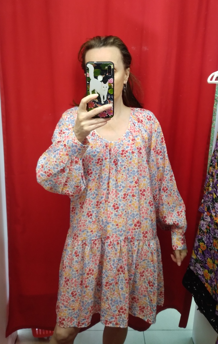 Здравствуйте, сегодня продолжу обзор из секонда, 490 рублей за кг. Цветочное платье из хлопка. Всё оно пышное, пышные рукава на широких манжетах, горловина тоже присборенная и широкая оборка. Нежные цветочки, очень они подходят к такому платью. Ещё платье из хлопка. Немного расклешенное, рукава 3/4, застежка на спинке есть маленькие подплечники. Черное с небольшим рисунком, показалось мне мрачноватым. Эту куртку можно с чистой совестью назвать зимней. С толстым утеплителем, воротник с мехом, капюшон с пушистой меховой оторочкой, есть молния, ветрозащитная планка и сверху ещё клеванты, которые больше для красоты. Куртка хорошая, но тяжёлая, хотя цена все равно получится более, чем приемлемая. Бирка так перекрутилась на вешалке, что не смогла её вытащить. Тонкий, но плотный трикотаж. Криво, но видно, что большой узор располагается по плечам и по части рукавов реглан. Черный-черный жакет, пришлось сделать фотку светлее, иначе ничего не видно. Фактурная ткань с добавлением серебряного лю