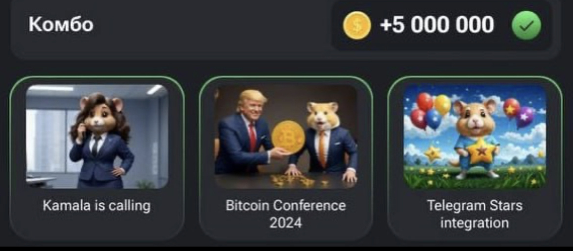 Комбо карты на 25.07 Бонус за выполнение задания +5 млн. Где найти комбо карты : ✅Bitcoin Conference 2024 - Specials ✅Telegram Stars integration - Specials ✅Kamala is calling - Specials ПОДПИСЫВАЙСЯ НА МОЙ КАНАЛ , ЧТОБЫ НЕ ПРОПУСТИТЬ ОБНОВЛЕНИЯ HAMSTER COMBAT 🐹