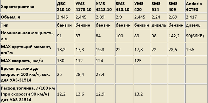 Параметры двигателей для УАЗ сведены в таблицу: