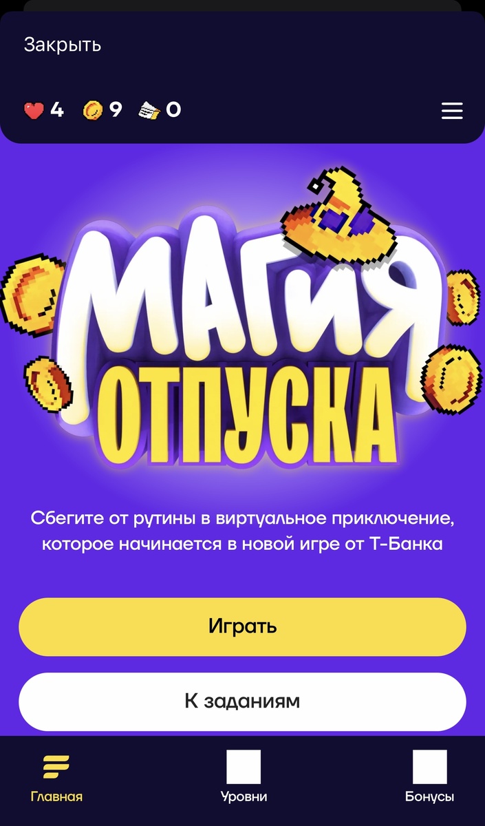 25 июля Т-Банк запустил новую игру Магия Отпуска Главному герою необходимо собирать монетки и избегать препятствий перепрыгивая их. Чтобы перепрыгивать препятствия нужно тапать на экран смартфона. Ежедневно даётся 4 жизни(попытки) для прохождения новых уровней и заработка золотых монеток. Так же ежедневно вас ждет подарок. Заработанные монетки можно потратить в магазине бонусов, тем самым прокачивая себе различные категории кешбека. Или покупать билеты на розыгрыш, который пройдет 27 августа 2024г. Игра завершится 12 августа. 27 августа будет проводится розыгрыш призов. Главные призы. 3 счастливчика получат по 500 тысяч рублей. Так же огромные кешбеки на покупку авиабилетов и бронирования гостиниц. И в завершение, вероятность выйграть один период сервиса Premium. Игру можно найти в поисковой строке приложения, набрав, Магия Отпуска или по ссылке Т-Банка. Желаю удачи в игре =)