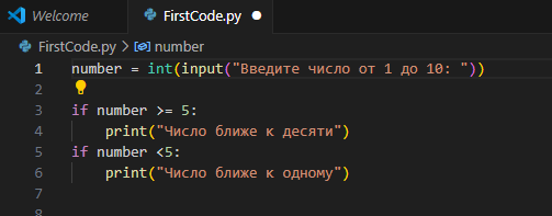 В сегодняшнем уроке мы разберём условное ветвление в Python. Для начала посмотрим, что такое if. If в переводе с английского означает "если", то есть "если это так, то мы делаем это". Допустим, что при вводе числа с клавиатуры от 1 до 10 мы бы хотели, чтобы если число больше или равно пяти, то выводилось сообщение, что число ближе к десяти, а если число меньше пяти, то выводилось сообщение, что число ближе к одному. Это будет примерно так: После того как вы написали if, а затем условие, нужно ставить двоеточие. После этого вам необходимо будет нажать Enter, и вы будете писать сразу с нужным количеством отступов или сами сделать эти отступы. Отступы можно сделать двумя самыми простыми способами: первый — это нажать на Tab, но иногда, когда вы пишете сложный код, может возникнуть ошибка именно из-за того, что вы использовали Tab. Также можно просто нажать четыре раза на пробел (не практично). Но вместо того чтобы писать два раза if, можно написать if, а затем else. Else переводится с анг
