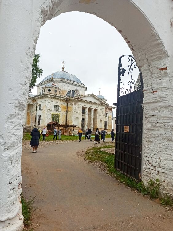 Я издалека заглянула на территорию, где живет братия монастыря, там такая арочная стена уже восстановлена.