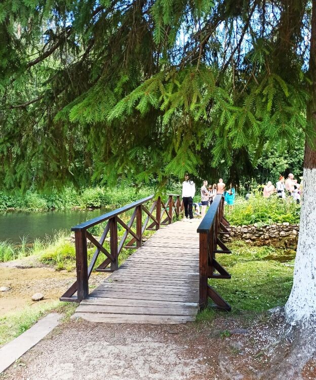 Опять же уточки с утятами. И даже лебедь подплывал. Все ручные, выходят на берег и шастают между посетителями. Есть «но» - носик попудрить не ходите в специальное заведение (хорошо, что оно находится далеко от родника и вообще не на территории), идите сразу в лес.