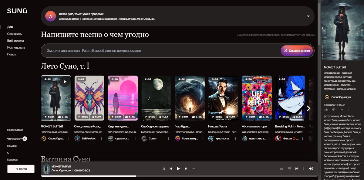 Все мы когда то мечтали стать если не музыкантами, то творческими деятелями. Благодаря современным технологиям, в особенности нейросетям, это стало более чем реальным. Искусственный интеллект уже давно не ограничивается простыми задачами и с каждым днем находит все новые применения. Одним из наиболее увлекательных направлений является создание музыки. Suno AI — это одна из таких систем, которая использует алгоритмы машинного обучения для создания музыкальных композиций. Что такое Suno AI? Suno AI — это нейросеть, разработанная для автоматизации процесса создания музыки. Она может генерировать музыкальные треки в различных жанрах и стилях, исходя из заданных пользователем параметров. Это может быть темп, жанр, настроение музыки или даже конкретные музыкальные инструменты. Для начало следует зайти на сам сайт, после чего нажать на кнопку войти. На сайте есть множество способов входа, от номера телефона до google почты. После того как вы зарегистрировались вам будет доступна кнопка creat