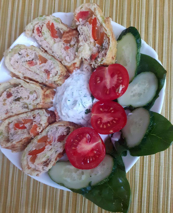 Летнее сытное блюдо для всей семьи. Для бризолей: ✔ Кабачок - 250 г; ✔ Яйца - 3 шт.; ✔ Молоко - 1 ст. л.; ✔ Мука - 1 ст. л.; ✔ Фарш - 300 г; ✔ Помидор – 1 шт.; ✔ Соль, смесь перцев, зелень. Трём кабачок на тёрке. Отжать, посолить, поперчить, добавить рубленую зелень. Взбить яйца с молоком и мукой. Смешиваем кабачки с омлетной смесью и выпекаем «блинчики». Каждый «блинчик» смазываем фаршем (у меня фарш из индюшиного бедра, в фарш я добавила зеленый лук и помидорки). На фарш я положила дольки болгарского перца. Свернуть рулетиками, и на противень в духовку при 170-180 градусах на полчаса. Соус - из домашнего йогурта с чесноком и укропом. КБЖУ бризолей с пшеничной мукой (на 100 г) - 114/7,4/7,8/3,5. КБЖУ бризолей с нутовой мукой (на 100 г) - 114/7,6/7,9/3,1. + 5 фото Рецепт на странице Автор рецепта – Tatiana Azovochka © Почтенный возраст Online и Рецепты для диабетиков