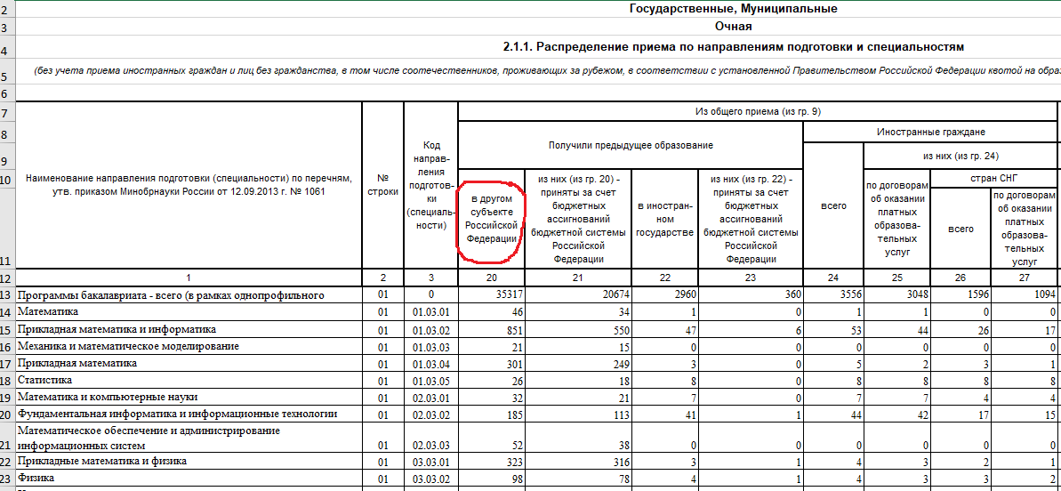 Здесь приведено количество поступивших на первый курс из другого региона, а также число иностранцев по каждому из примерно 500 направлений подготовки в бакалавриате, специалитете и магистратуре. На соседней вкладке 2.1.1 (1) можно посмотреть общее число принятых на 1 курс.