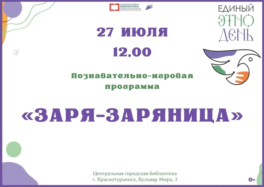 Посетителей ждут игры народов Урала: «Золотые ворота», «Юрта», «Петушиный бой», «Татарский хоровод» и другие. Будет представлена выставка книг, авторы которых рассказывают о народах России, об их традициях, обычаях и культуре.