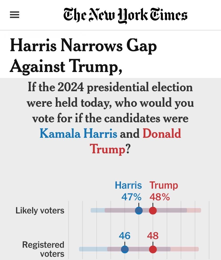 Любимая песня Трампа «Время сказать Прощай» Представьте себе: после отказа Джо Байдена от президентской гонки, опросы показывают, что Трамп и Харрис идут почти вровень, разделённые всего лишь одним процентным пунктом среди вероятных избирателей. Трамп опережает Харрис на 48-47% – настоящий триллер! Это значительное улучшение для демократов по сравнению с опросом в начале июля, когда Байден отставал на целых 6% после неудачных дебатов, которые окончательно вывели его из гонки. Какой сюжет! Байден, который когда-то казался непоколебимым, вдруг пал жертвой своей неудачи, и Харрис, как Феникс, восстала из пепла, чтобы бросить вызов Трампу. Величественное противосто