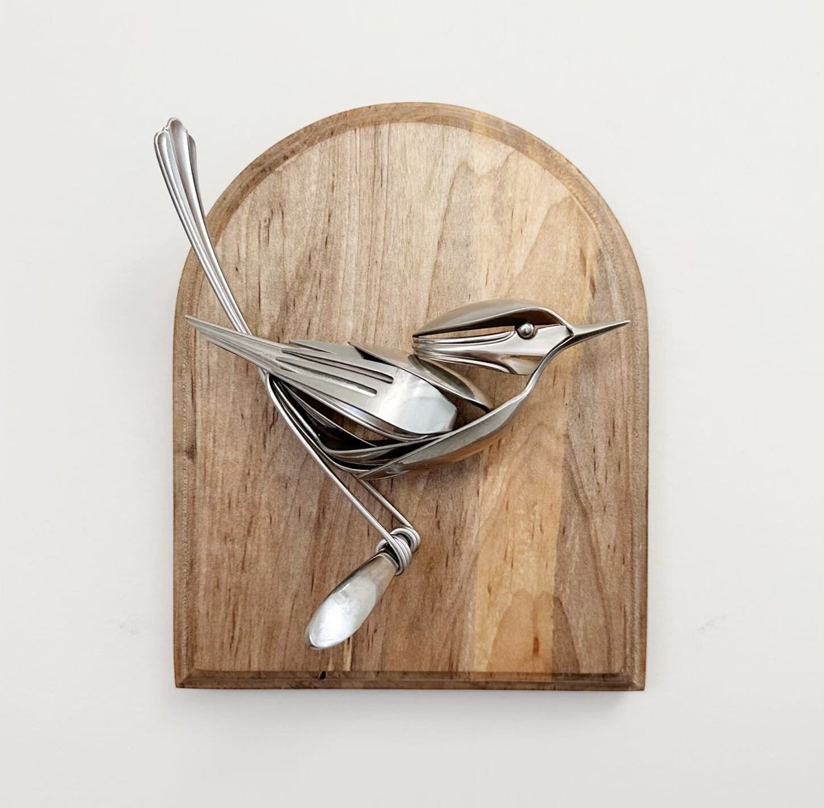 Творец Мэтт Уилсон последние 15 лет превращает найденную посуду в скульптуры из переработанного металла. При сгибании, сварке и установке сегментов столовых приборов друг на друга чаши для ложек напоминают оперение, а зубцы вилок – вытянутые иглы. Уилсон использует уникальные декоративные детали, которые украшают ручки столового серебра. «Чем старше я становлюсь, тем больше меня завораживают птицы. Чем больше я наблюдаю за ними и обращаю на них внимание, тем больше у меня появляется вдохновения пробовать разные позы», – делится Уилсон. Сидя на фоне деревянной арки или отдыхая на ветке на открытом воздухе, каждая птица вписывается в органичное, естественное окружение, которое контрастирует с ее жесткой металлической формой. Художник использует материалы из вторых рук, подчеркивая, что «это такой надежный источник, запасы которого, казалось бы, бесконечны. Они всегда есть в наличии в благотворительных магазинах.» Работы Мэтта Уилсона нашла тут – https://airtightartwork.com/ Как вам так