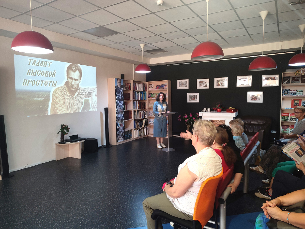 «Писать надо так, чтобы слова рвались, как патроны в костре» Василий Шукшин Василий Шукшин – самородок русской земли. За всю свою жизнь он написал 125 рассказов, снял около 30 картин и, кроме того, еще успевал сниматься в чужих фильмах. За свои 45 лет Василий Макарович успел сделать очень много. Не каждый человек способен трудиться с такой бешеной работоспособностью. 25 июля в Центральной библиотеке состоялась литературная гостиная «Талант высокой простоты», посвященная 95-летию со дня рождения Василия Макаровича Шукшина. Библиотекарь Елизавета Булатова рассказала гостям о трудном детстве писателя, об учебе, любви к книгам и поисках себя. Василий Шукшин не сразу пошел учиться во ВГИК, сначала будущий режиссер работал и слесарем, и учителем, и директором школы. Но с самого детства Шукшин тянулся к кино, в чем не раз признавался своей сестре Наталье. Не смотря на пробелы в знаниях, Василию Макаровичу удалось поступить во ВГИК на режиссерский. Ведущая рассказала и о его личной жизни, в