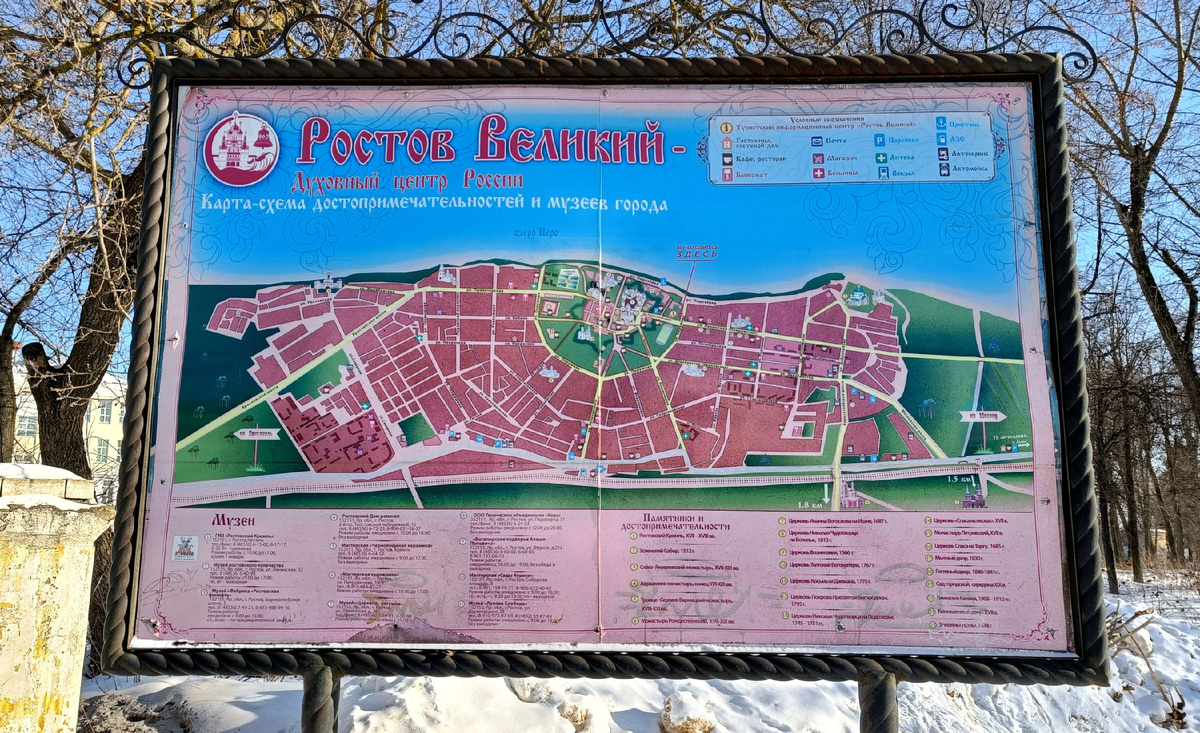 Ростов Великий – городок небольшой. Даже если учитывать его современные границы, от одной окраины до другой вы будете идти пешком часа два, не больше. А исторический центр и того меньше: расстояние между двумя крайними точками на берегу озера Неро на запечатлённой мной карте-схеме выше – чуть больше пяти километров.