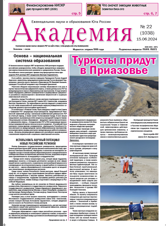 В августовском номере Еженедельника науки и образования Юга России вышла статья «Основа – национальная система образования». В ней освещен съезд Российского союза ректоров в МГУ имени М.В. Ломоносова 4 июля 2024 года, на котором были подтверждены полномочия президента Союза ректоров академика Виктора Садовничего. Донецкую Народную Республику на съезде представляла председатель Совета ректоров вузов ДНР, ректор ДонГУ Светлана Беспалова. В еженедельнике представлено ее выступление на пленарном заседании съезда. Светлана Беспалова раскрыла потенциал науки и образования новых российских регионов, которые в перспективе могут обеспечить весомый вклад в достижение всеобъемлющего лидерства отечественной науки (стр. 1, 4). Также читатели могут ознакомиться с историей и тем, что сегодня представляет собой ведущий вуз Донбасса – Донецкий государственный университет (стр. 5, «Донецкий классический в действии»).