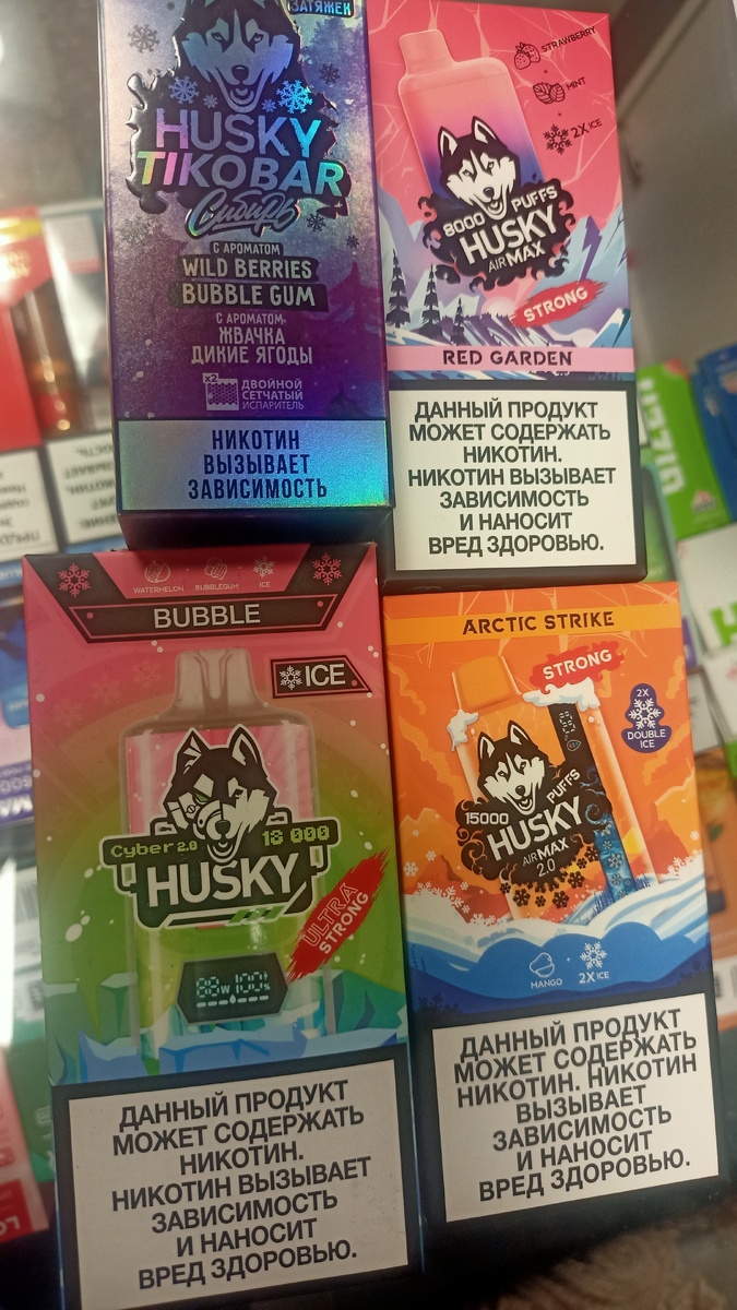 Приветствую дорогие читатели,сегодня Будет представлен мини обзор на новинки бренда одноразок и жидкостей Husky, а именно новинки от этого производителя, сравним новые модели, опишим их отличие и схожесть. HUSKY AIR MAX 8000 HUSKY AIR MAX 2.0 puffs 15000 HUSKY Cyber 2.0 puffs 18 000 HUSKY TIKOBAR Сибирь 12 000 Помню пропадали с рынка Husky одноразки и жидкости и сейчас быстрыми темпами штампуют новые виды и везут на российский рынок уже маркированные хаски на новый лад, с соответствием с новыми правилами в законодательстве о регулировании вейп продукции. Никотин вредит здоровью. Чем похожи все модели бренда Husky? Двойным холодком, летними вкусами и крепостью выше средней, а так же плюс минус схожий дизайн упаковки и самого устройства, а именно обозначение снежинкой кулер или двойного кулера, что поможет вам охладится в летнюю жару или просто любителям хорошего вкуса и холодка в одноразках. В чем же отличия моделей? Первая модель HUSKY AIR MAX 8000 первая на вейп рынке, содер