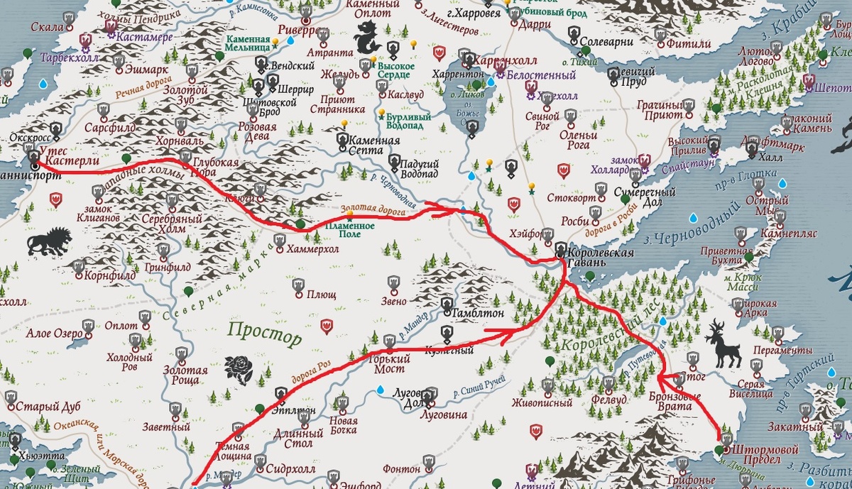 Вот Золотая дорога, ведущая из Ланниспорта, вот дорога Роз, по которой в «Игре престолов» будет поставляться провизия Тиреллами, вот дорога от самого близкого к вам замка ваших вассалов – лорда Баратеона. Под боком у вас Королевский лес, где король Роберт Баратеон встретит вепря: отправьте туда охотников.