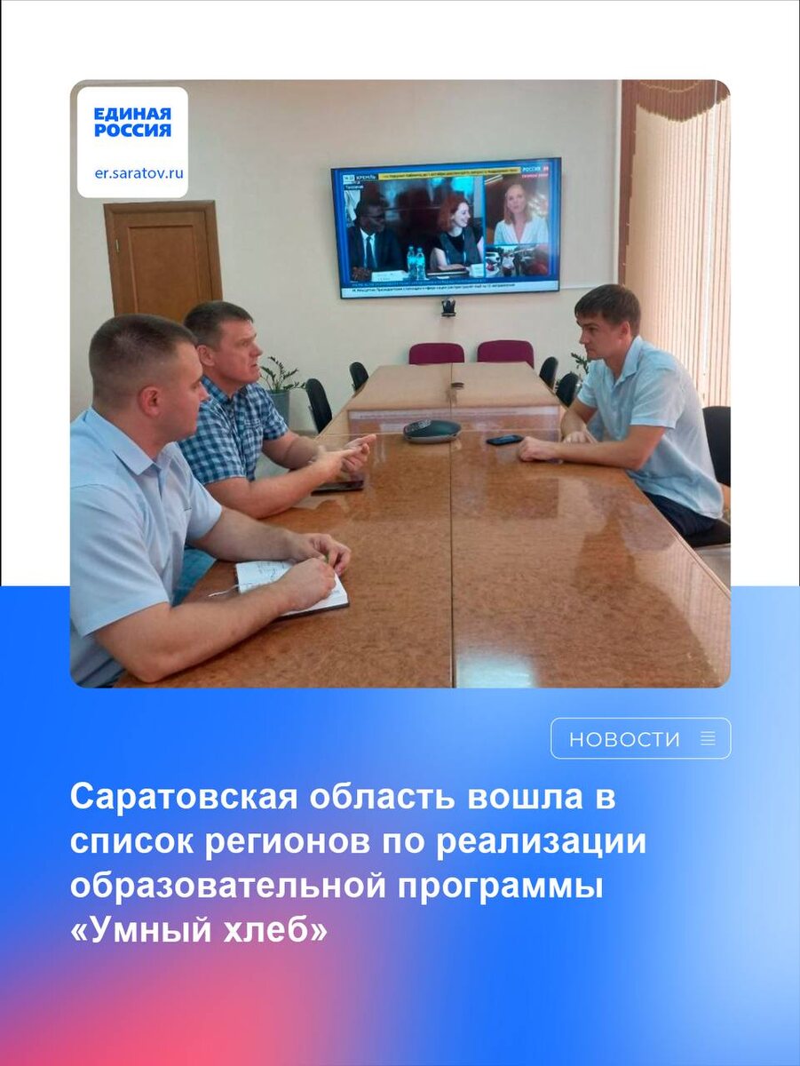 🇷🇺Программа запущена в рамках федерального проекта «Выбирай своё» партии «Единая Россия». 📚Образовательная программа «Умный хлеб» направлена на повышение уровня компетенции в использовании и внедрении новейших технологий на базе искусственного интеллекта в сельском хозяйстве. Саратовская область вошла с перечень стартовых регионов, которые станут первыми по реализации данного направления. 👥В рамках реализации программы региональный координатор партийного проекта «Выбирай своё» Александр Романов провел встречу с представителями Министерства сельского хозяйства Саратовской области: начальником отдела технической политики и ГИС-технологий Михаилом Королевым и директором «Информационно-консультационной службы агропромышленного комплекса Саратовской области» Алексеем Пылыпивым 💬«На встрече обсуждались вопросы по реализации программы «Умный хлеб». В результате встречи был определен ответственный за реализацию образовательной программы «Умный хлеб», а также площадки для проведения обр