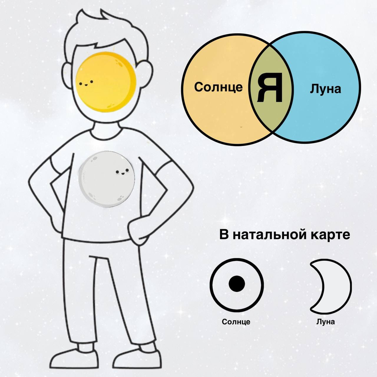 Грубо говоря - есть «Я» и есть «Моё» (как мозг и сердце). И из этих двух составляющих формируется бОльшая часть нашей личности. В общем, без них (без Луны и Солнца) мы - просто не мы!