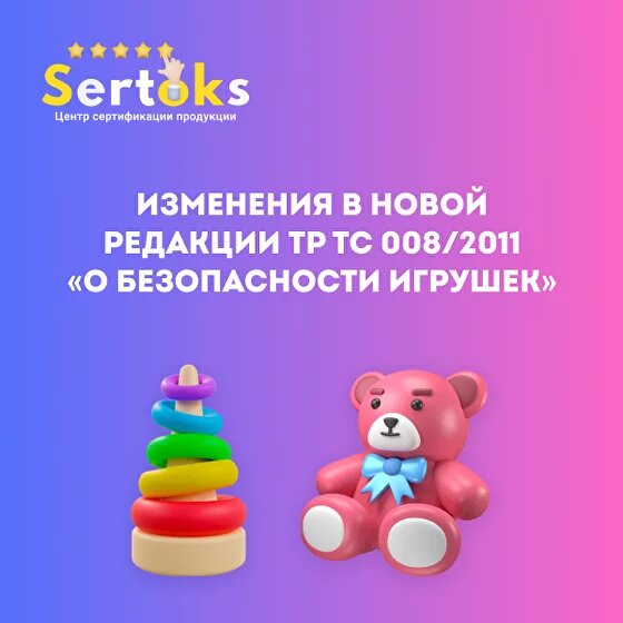 Информирую о том, что 26 ноября 2024 г. ТР ТС 008/2011 «О безопасности игрушек» вступит в силу в новой редакции. Изменения в регламент приняты решением Совета Евразийской экономической комиссии (ЕЭК) № 50 от 14 мая 2024 г.