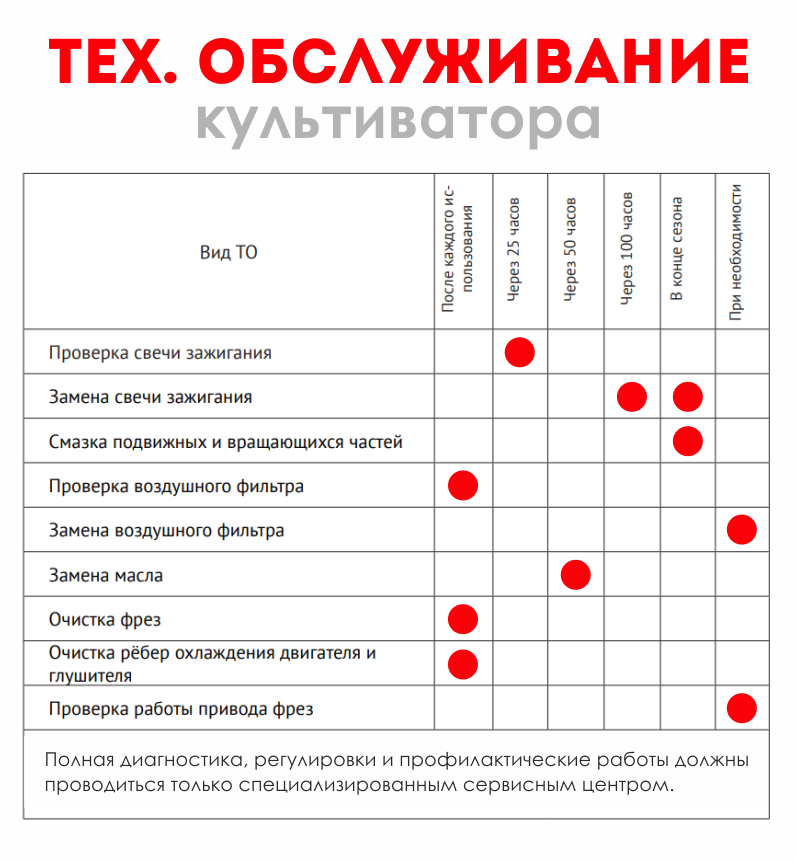 Все работы по техническому обслуживанию следует проводить при выключенном двигателе и отсоединённом колпачке высоковольтного провода свечи зажигания! Перед каждым использованием - проверить уровень топлива и масла, при необходимости долить до требуемого уровня; - проверить затяжку всех крепёжных элементов (болтов, винтов, гаек); - проверить работу рычагов управления, при необходимости отрегулировать. Свеча зажигания Периодичность проверки – через каждые 25 часов работы. Периодичность замены свечи – через каждые 100 часов работы (или в конце сезона). Воздушный фильтр Периодичность проверки – через каждые 25 часов работы. При работе в сильно запылённой атмосфере следует проводить более частую проверку. Воздушный фильтр следует заменить: при обнаружении его дефектов, изменении цвета выхлопных газов или при неустойчивой работе двигателя. Замена масла в картере двигателя Периодичность проведения – после первых 20-ти и далее через 50 часов наработки. Внимание! Не производите самостоятельную