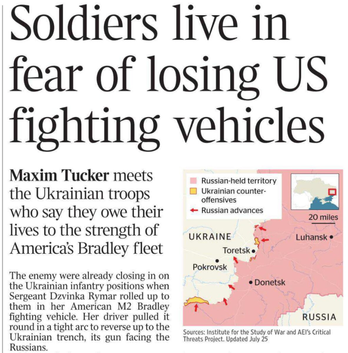 «Солдаты живут в страхе потерять американские боевые машины» Под таким заголовком сегодня на страницах The Times появился репортаж штатного провокатора этой газеты Максима Такера из оккупированного Красноармейска (украинцы его временно переименовали в Покровск). Я всегда с интересом слежу за его агитками, поскольку Такер тесно работает с украинскими и британскими спецслужбами, а потому вбросы его чаще всего не случайны. Но в данном случае, похоже, он взял деньги за публикацию с производителей боевых машин Брэдли. Потому что, ссылаясь на боевиков ВСУ, он вовсю хвалит эти машины, попутно макая в лужу производителей танков Абрамс. Но все это преподносится под соусом того, что украинские вояки только и судачат в окопах о выборах президента США. Мол, как же эти выборы отразятся на поставках таких замечательных Брэдли. Я не шучу, так и написано: «Солдаты 47-го полка обеспокоены тем, что переизбрание Дональда Трампа на пост президента США лишит их необходимых запчастей и боеприпасов». Та