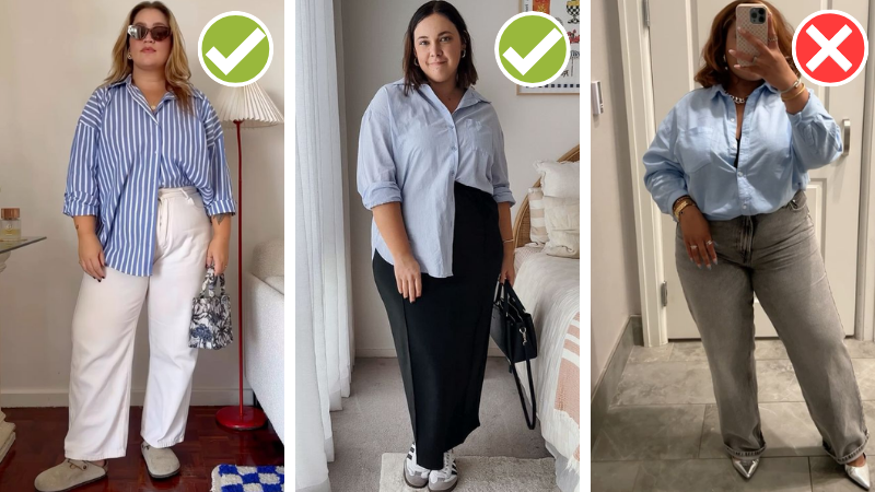 ❌ Стилизованная привычным способом рубашка смотрится слишком просто, да еще и делает акцент на выпирающий животик.