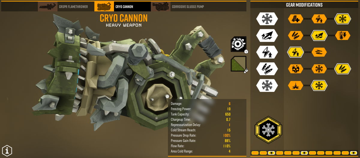 Когда-то был чистым и был Super, теперь баланс и просто Tuned Cooler. Тем не менее, очень даже хорош. Экстра фриза, само собой, быстрее морозит обычных противников, но именно 10 мороза позволяют фризить дредноутов и детонаторов (без учёта радианса). В Т1 берём, само собой, +1 фриз, но и скорость раскрутки хороший вариант. Во 2 тире, аналогично огнемёту, в 90% случаев берётся дальность. В 3 строке же мы почти нейтрализуем минус оверклока модом. В Т4, за редкими исключениями, всегда берутся патроны. Против дредноутов же я бы взял ещё + к заморозке.