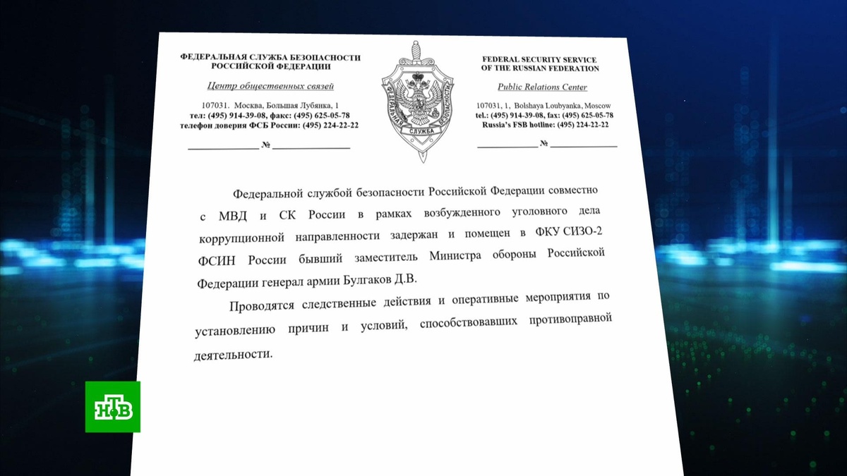 [ Смотреть видео на сайте НТВ ] Бывший заместитель министра обороны России генерал армии Дмитрий Булгаков задержан и сейчас находится в СИЗО, сообщает Центр общественных связей ФСБ. Уточняется, что генерал задержан в рамках «уголовного дела коррупционной направленности». Детали не приводятся. Официальный представитель СК РФ Светлана Петренко также сообщает о возбуждении дела в отношении Булгакова и его аресте. С ним проводятся следственные действия. Булгакову 69 лет. Он занимал пост замминистра обороны РФ с 2008 года по 24 сентября 2022-го, курировал в военном ведомстве вопросы материально-технического обеспечения Вооруженных сил. В 2016 году Булгаков был удостоен звания Героя России. Напомним, что ранее был арестован другой бывший замглавы Минобороны РФ — Тимур Иванов, который курировал вопросы строительства. [ Смотреть видео на сайте НТВ ]