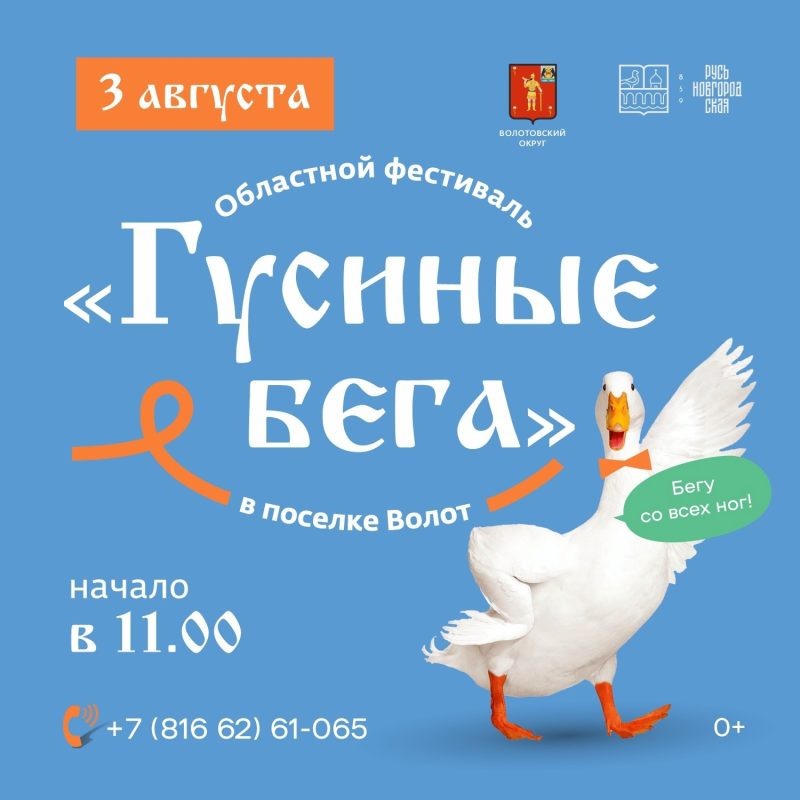 Областной фестиваль «Гусиные бега» пройдет на стадионе поселка Волот 3 августа. Начало – в 11 часов. Вы познакомитесь с традициями Волотовского округа и получите заряд энергии на целый год. Вас ждут мастер-классы, дегустация блюд традиционной народной кухни, ярмарка сувенирной продукции, выступления творческих коллективов и соревнования среди домашних гусей. Программа фестиваля 11.00 – начало работы интерактивной площадки «Волотовское подворье»: – конкурс пирогов