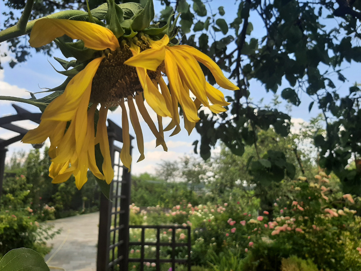 Для начала хочу извиниться за то, что немного "забила" на своевременные публикации, честно-честно, была очень большая загруженность на работе. Смогла спокойно выдохнуть только после 25 числа (бухгалтера поймут). И вот хочу Вам показать что творится в моём саду на данный момент. Всю зиму с кормушки на землю попадали семечки и весной несколько штук взошло. Шутки ради, я их оставила. Сейчас они уже отцветают, так что мои птички самостоятельно позаботились о своей кормовой базе, это, если рассуждать с практической точки зрения. Но ведь была ещё и незапланированная красота, подсолнухи смотрелись необычно и свежо. Заглядывая на свою горку, я обнаружила, что во внеурочное время зацвела серебристая брунера. Возможно, потому что муж часто туда кидает поливочный шланг, просто это ему удобно, ни в какие колючие дебри заходить не надо, стоя на плитке положил и всё. А может быть это последствия града, растение испытало стресс и вот с испугу расцвело. Ну, вот что у нас никогда не поливается, так эт