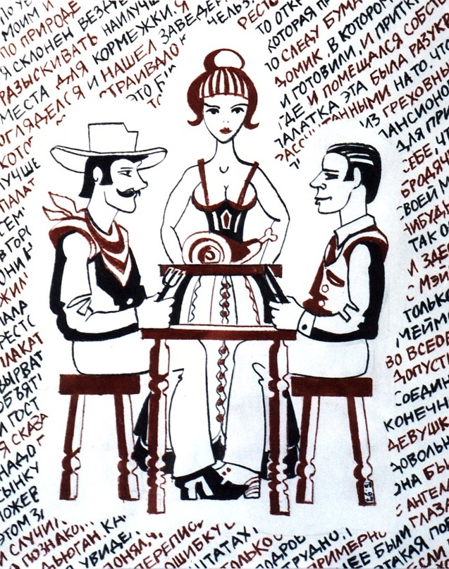 "'Go easy,' I interrupts; 'where's the chicken liver pie, and the kidney saute on toast, and the roast lamb, and--'