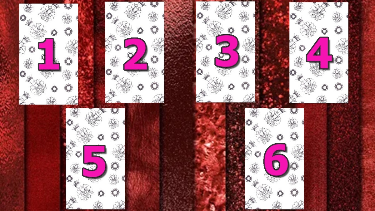Вы можете задать вопрос: «Женится ли он на мне?» или «Какова вероятность того, что наши отношения станут официальными?» Для этого вам нужно визуализировать своего партнёра и выбрать одну из предложенных карт. Сегодня я буду использовать шесть позиций карт. Вы можете интуитивно выбрать одну из них, представляя своего партнёра и задавая вопрос о возможности официального заключения ваших отношений.