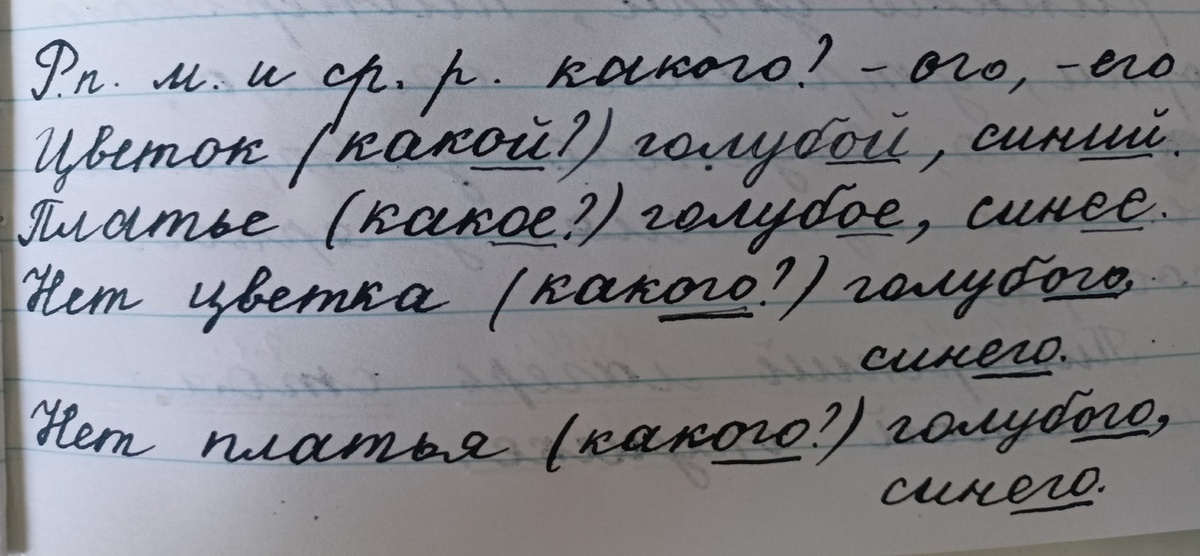 1. Проверка домашнего задания. Упражнение 100. Дети читают придуманные предложения, определяют падеж прилагательных. 2. Объявление темы урока и актуализация знаний. - Откройте словарик в конце учебника и выберите любое существительное 2-го склонения. (Дети называют слова автомобиль, яблоко, лагерь, болото и т.д., эти слова записывают на доске). Сегодня мы будем учиться писать эти окончания. 3. Работа по теме урока. Откройте учебник на стр. 31 и прочитайте, на какой вопрос отвечают прилагательные мужского и среднего рода в Р.п. (какого?). Рассмотрите таблицу. Спишите таблицу в тетради. Окончания прилагательных -ого и -его - это орфограммы: Упражнение 103. Теперь, когда вы знаете, какие окончания надо писать у прилагательных в родительном падеже, вы сможете выполнить списывание предложений, изменяя прилагательные из именительного падежа в родительный. Самостоятельная работа. Фронтальная проверка: Для учеников, которые выполнили работу раньше других, можно дать дополнительное задание: Уп