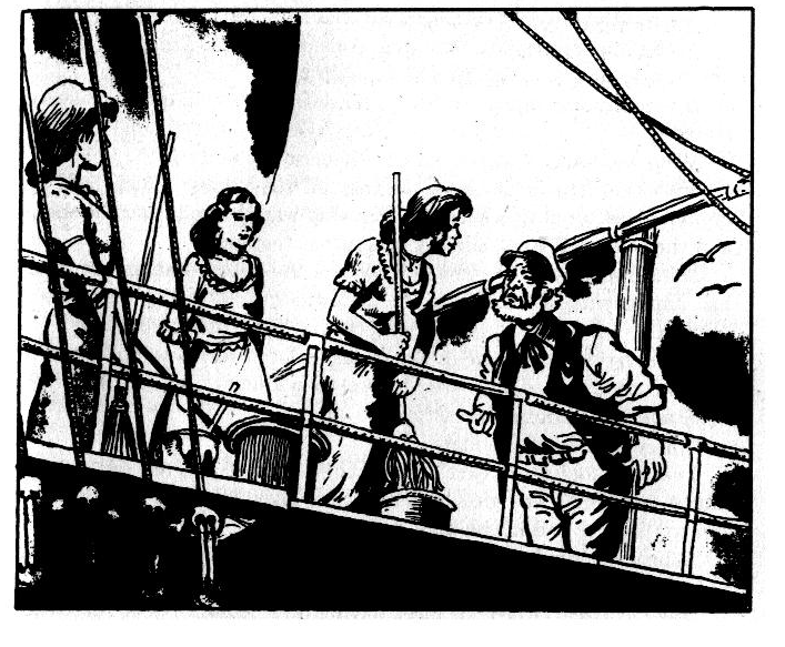"No, I can't go back," said the skipper. "You see what comes o' disobedience, my gells. Lively there on that mains'l, d'ye hear?"