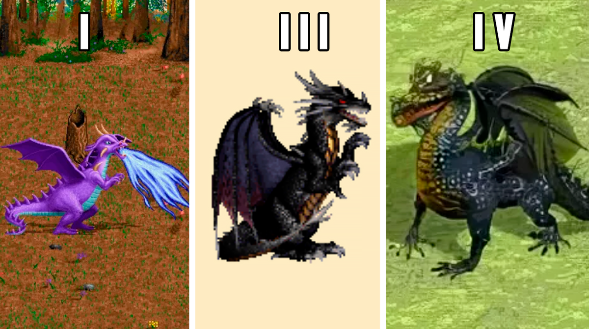 Тем не менее, я думаю, что разобраться в этом будет несложно, так как есть небольшая закономерность, позволяющая определить принадлежность драконов. Поэтому, давайте посмотрим как менялись черные драконы на протяжении всех игр серии "Герои меча и магии".