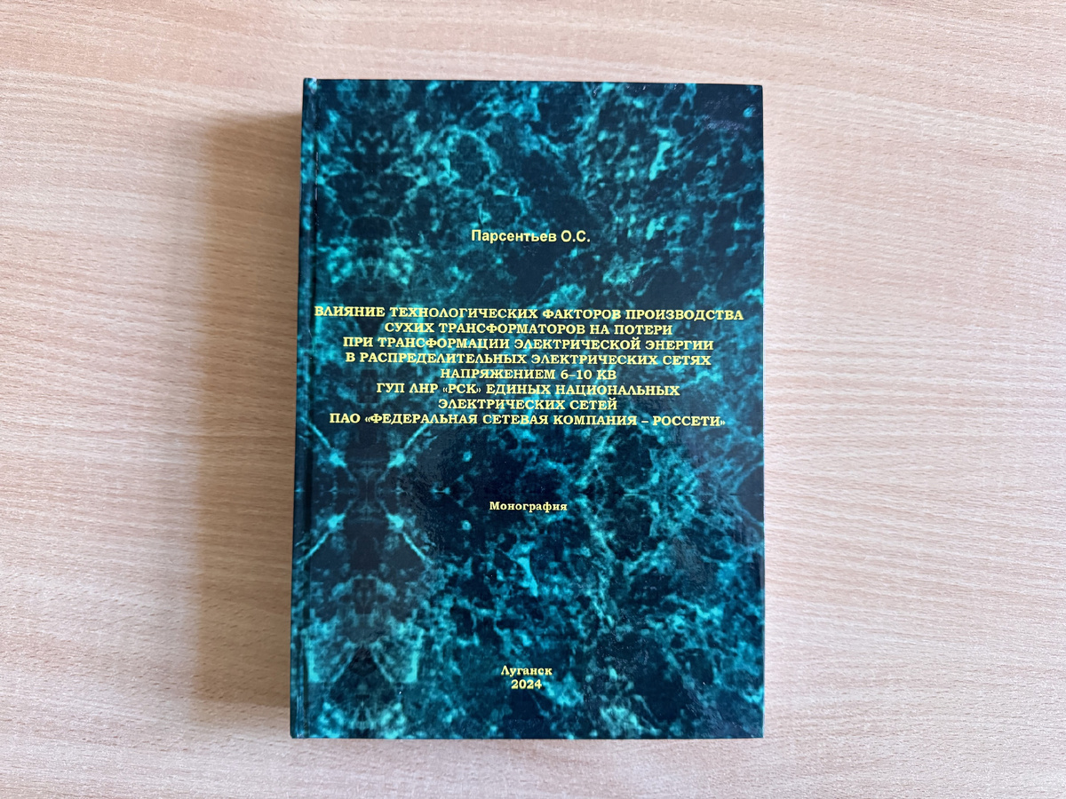 Вышла в свет монография ученого – к.т.н., доцента кафедры «Электроэнергетика», факультета «Приборостроение, электротехнических и биотехнических систем» ФГБОУ ВО «ЛГУ имени Владимира Даля» Парсентьева Олега Сергеевича под названием: «Влияние технологических факторов производства сухих трансформаторов на потери при трансформации электрической энергии в распределительных электрических сетях напряжением 6 – 10 кВ ГУП ЛНР «РСК» Единых национальных электрических сетей ПАО «Федеральная сетевая компания – Россети».