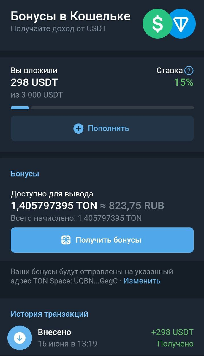 Итак, я вложил 298 USDT, и теперь моя инвестиция принесла 1,4 TON, что эквивалентно 9,5$ или примерно 3% прибыли.