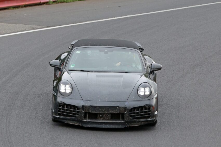 Недавно Porsche провела обновление семейства 911 в середине цикла, и, разобравшись с обычными моделями, теперь она может сосредоточиться на моделях Turbo. Тем не менее, давайте тепло поприветствуем предстоящий 911 Turbo S, который недавно был представлен в предсерийном варианте. Этот Porsche 911 Turbo S Cabriolet 2026 года был замечен во время обычных заездов на Нюрбургринге. Прототип имеет черный цвет и похожую виниловую пленку для некоторых компонентов. Хотя на первый взгляд можете не заметить отличий (эй, это же Porsche, в конце концов!), тем не менее, есть некоторые заметные. Очевидно, что фары новые, так как никакая пленка не могла бы скрыть новый рисунок, который ставит их в соответствие с остальной частью семейства 992.2. Передний бампер также новый и оснащен обновленными воздухозаборниками. Боковые теперь больше, а центральный немного уже. Также можем увидеть более толстый фартук, поэтому ожидаем, что эта модель может похвастаться улучшенной аэродинамикой и большей прижимной с