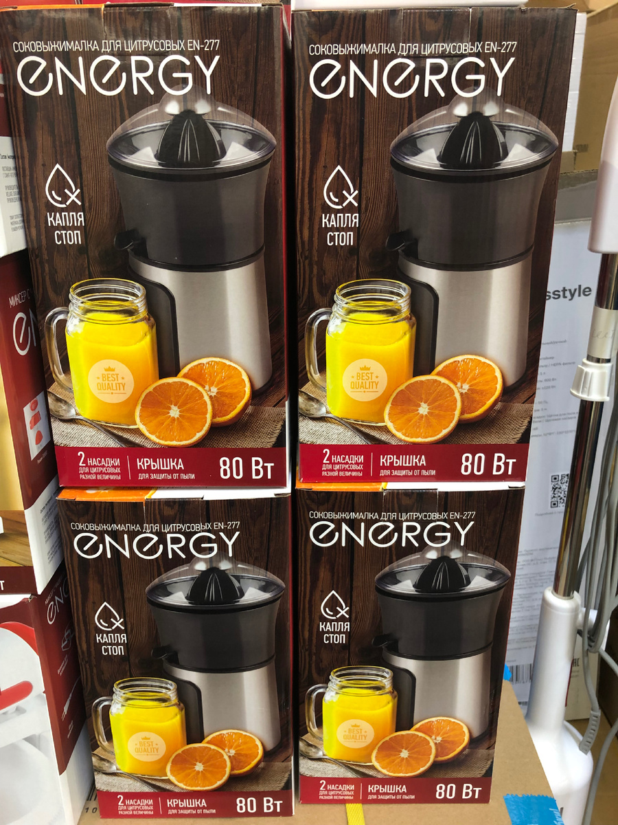 Первой новой позицией, которую я заметил, была соковыжималка для цитрусовых Energy. На мой взгляд, это весьма полезное приобретение, особенно если вы не представляете своих утренних ритуалов без свежего сока. Мощность соковыжималки составляет 80 Вт, что достаточно для быстрого и эффективного отжима сока. В комплекте идут две насадки разной величины — подойдут как для небольших мандаринов, так и для крупных грейпфрутов. Сделана эта замечательная вещь в Китае и стоит 1298 рублей. Вполне доступная цена за такую полезную штуковину, согласитесь?