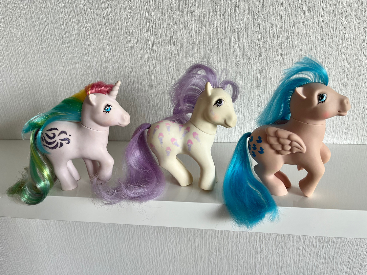 Всем привет 👋🏻 Получила новых поняш 🐴🦄 My little Pony (MLP сокращенно). Кому лень читать, то распаковка с ними запечатлена на видео ☺️ Про первого моего поника рассказывала в этой статье. Новых кстати заказала даже раньше первого, но была долгая доставка, зато в принципе выгодно мне обошлись🤗, учитывая теперешний ценник 💰каждый по 1100₽ без доставки. Месяца 3-4 назад это и были норм цены, но сейчас на Авито очень дорого 🙈 доходит до 4 тыс₽ за поника 😲 Я, конечно, имею в виду первое поколение (generation 1/ gen1), выпущеных с 1980х по середину 90х. Из третьего поколения уже подешевле и больше предложений. Новеньких покупала через группу ВК, очень сумбурно 🤪 Продавец долго не отвечала, я уже вообще хотела закончить с коллекционированием поняш 🥺 но тут сразу три наметилось😃 особо не расспрашивала про состояние, оплатила на карту 😅 Перед самым получением увидела отзыв, что присылают грязнуль, не помытыми 🙈 У меня были тоже с пятнышками, но я не расстроилась, учитывая ст