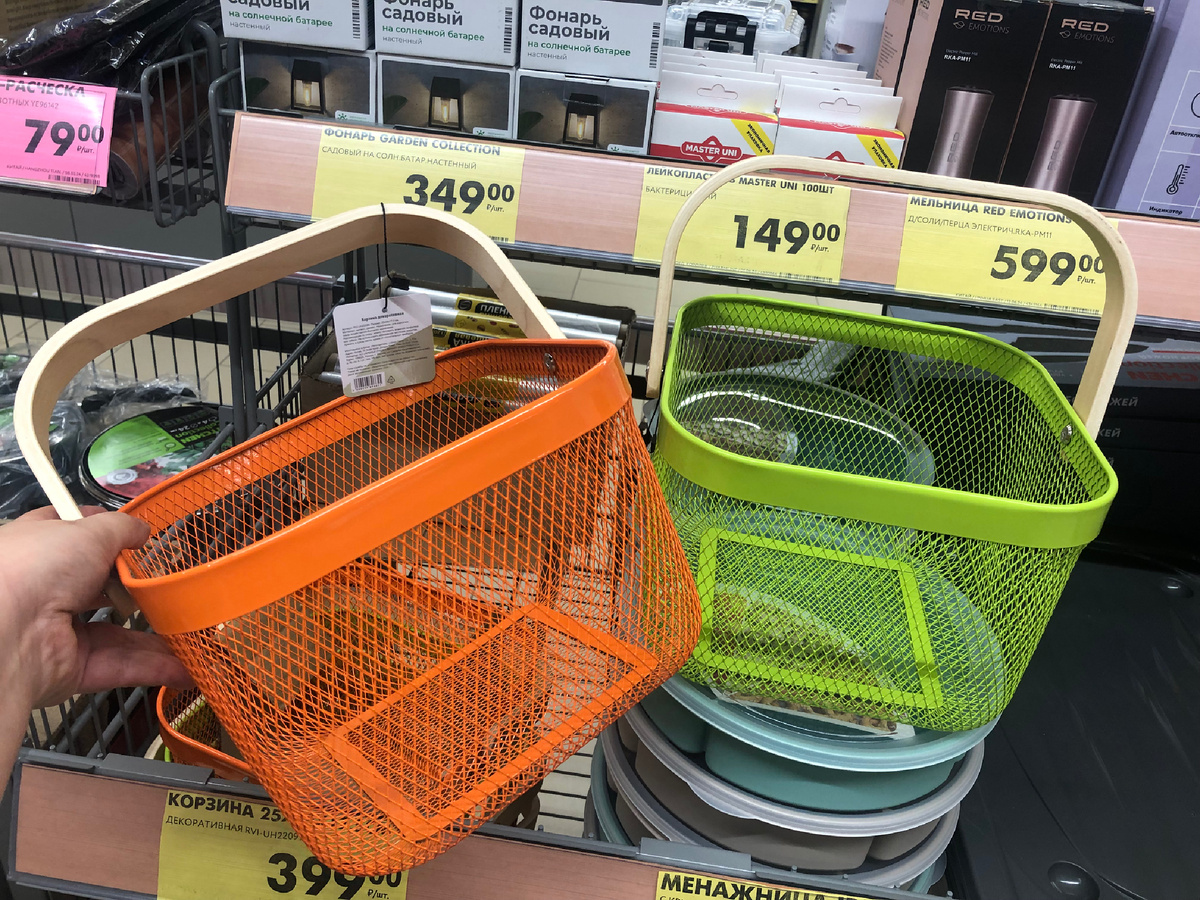 Первое, что бросилось мне в глаза, это цветные металлические корзины с деревянной ручкой. В наличии сейчас осталось два цвета, но раньше были и жёлтые, которые моментально разобрали. Размер корзины составляет 25x24x17,5 см. Сделаны они из металла и дерева, и смотрятся очень стильно. Такие корзины идеально подойдут для хранения мелочей или даже для пикников. Цена весьма приятная – всего 399 рублей. Изготовитель этих корзинок – Китай.
