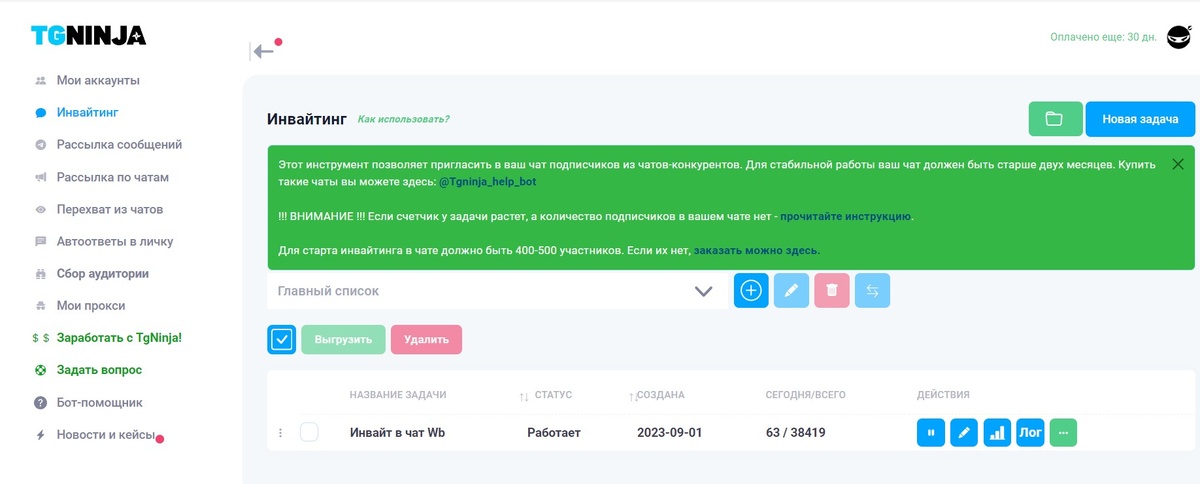 На момент составления обзора в ТГНиндзя доступен следующий функционал: