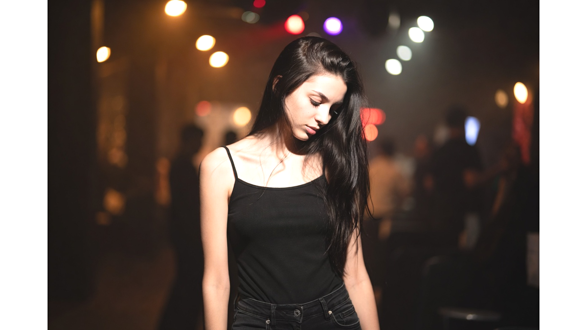 Народ танцевал, кто-то громко смеялся в углу. Недалеко от него стояла девушка — примечательная брюнетка с длинными волосами, в чёрном топе и черных узких джинсах.